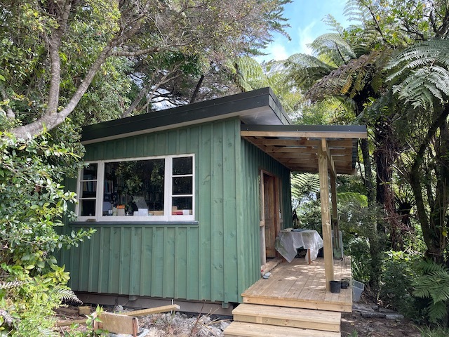 Across town and up the hill the art studio is also in use, now that it has been finished. It is peaceful and not over-looked by anyone so there is plenty of space and time to paint, write and sing. I have companions in friendly weka – two adults and a baby – and plenty of other birds and insects, including cicadas.
