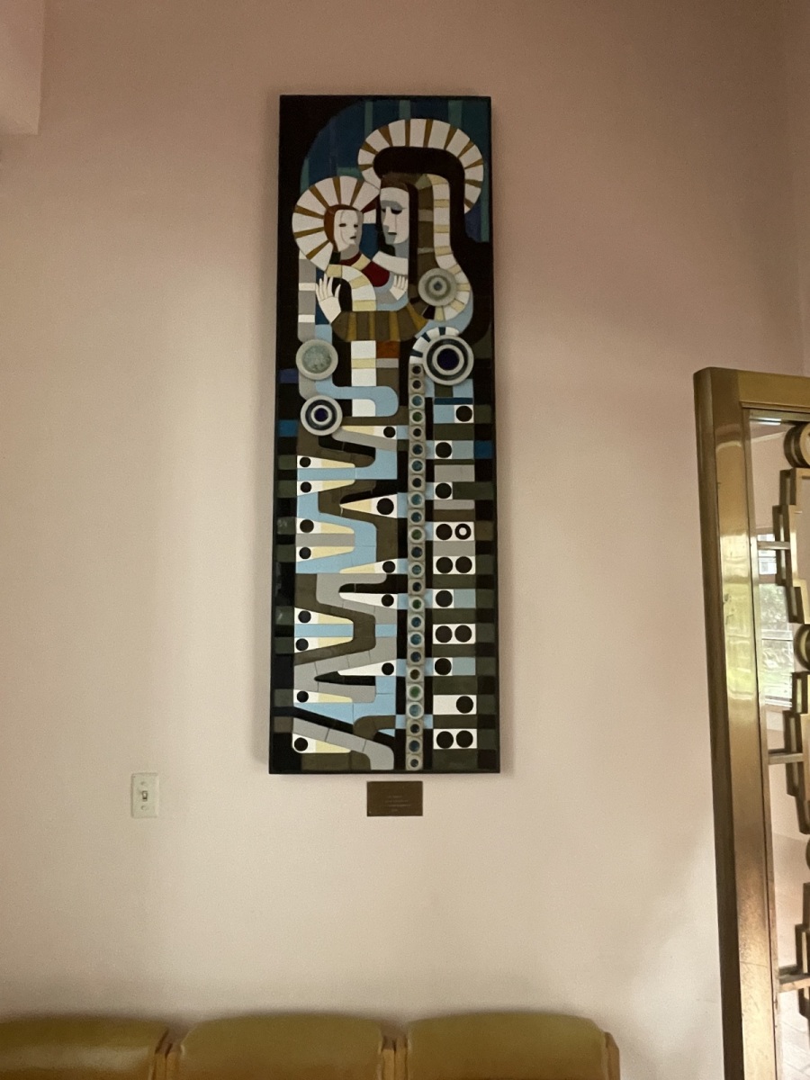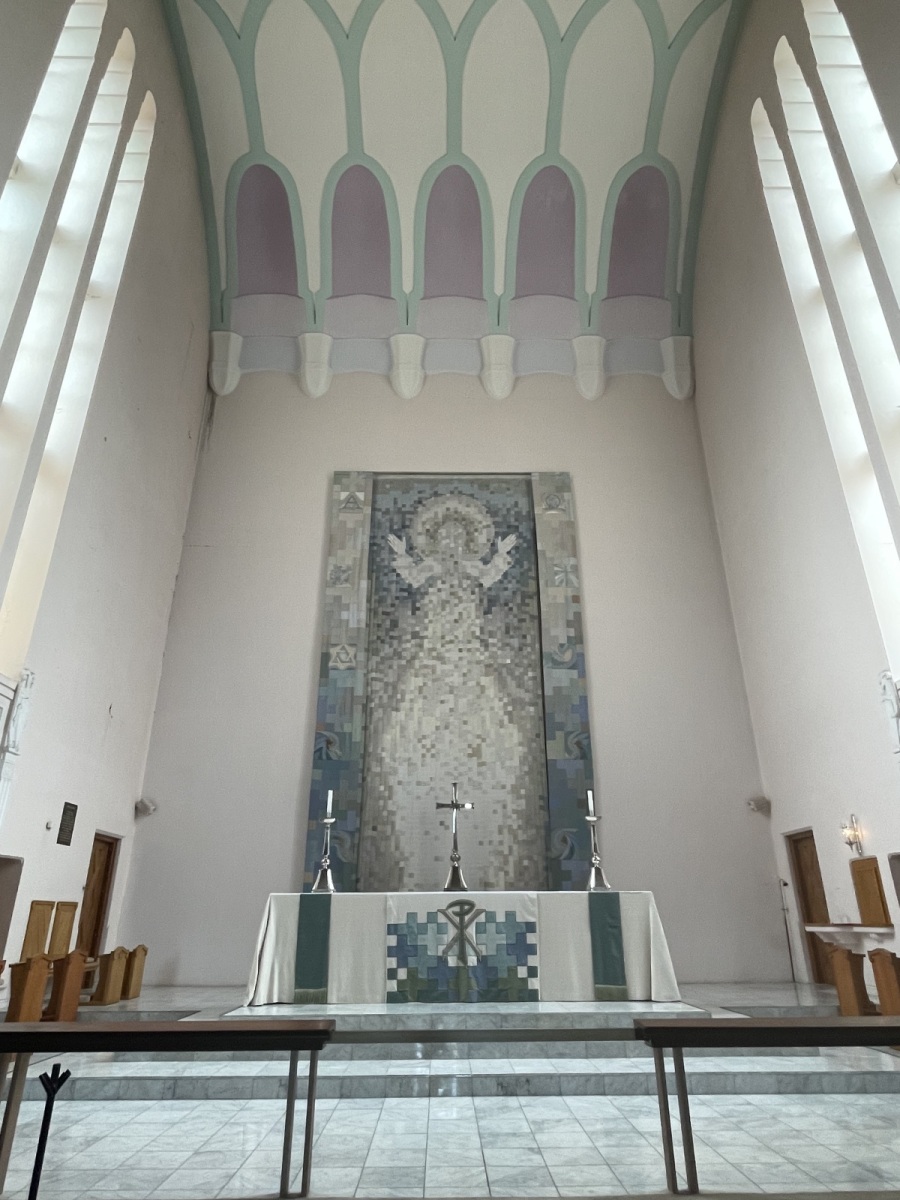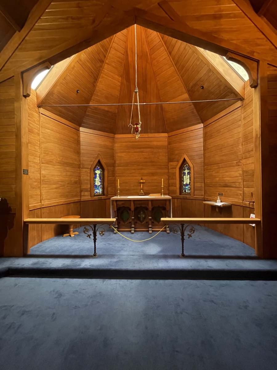 In the beautiful wooden Lady Chapel, once a church in Paraparaumu (55km north of Pōneke) and now removed and rebuilt as part of the cathedral complex, a banner for the Mothers’ Union (below) has an amusing anecdote along with its history attached.