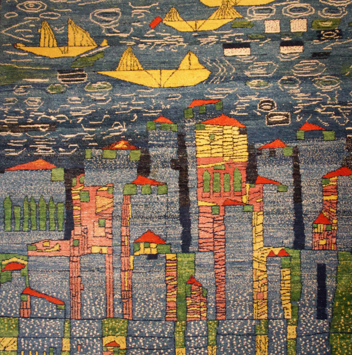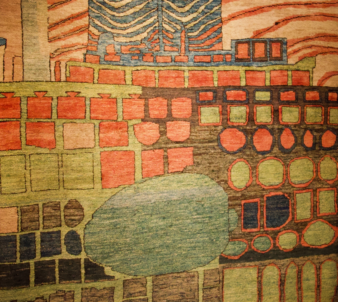 A visit to the Art Centre offered as glimpse into the artist’s development and his ideas through models, plans, paintings and drawings. It also showed that he worked with textiles in rugs and tapestry, using the technique in unusual ways to develop a relationship between the weaver and the work. He had his tapestries woven in Mexico at Fritz Riedl’s atelier and in Vienna where he worked with Hilde Jelinek-Absalon, and the rugs were woven in Afghanistan at Atelier Zia Uddin.