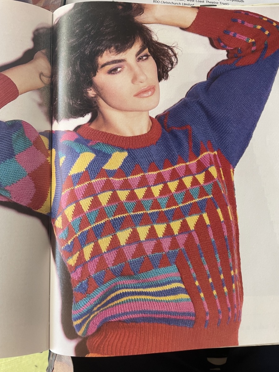 In this collection are pieces by Pierre Cardin, Kaffe Fassett, Zandra Rhodes, The Emanuels as well as Susan Duckworth, Jane Davies, Sirdar and Robin. There are others besides but all the designs have the distinction of being uniquely from the ’80s.