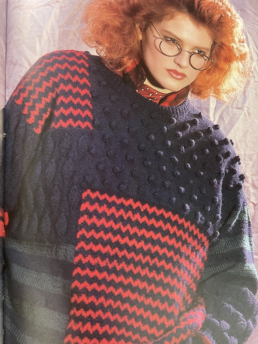 In this collection are pieces by Pierre Cardin, Kaffe Fassett, Zandra Rhodes, The Emanuels as well as Susan Duckworth, Jane Davies, Sirdar and Robin. There are others besides but all the designs have the distinction of being uniquely from the ’80s.